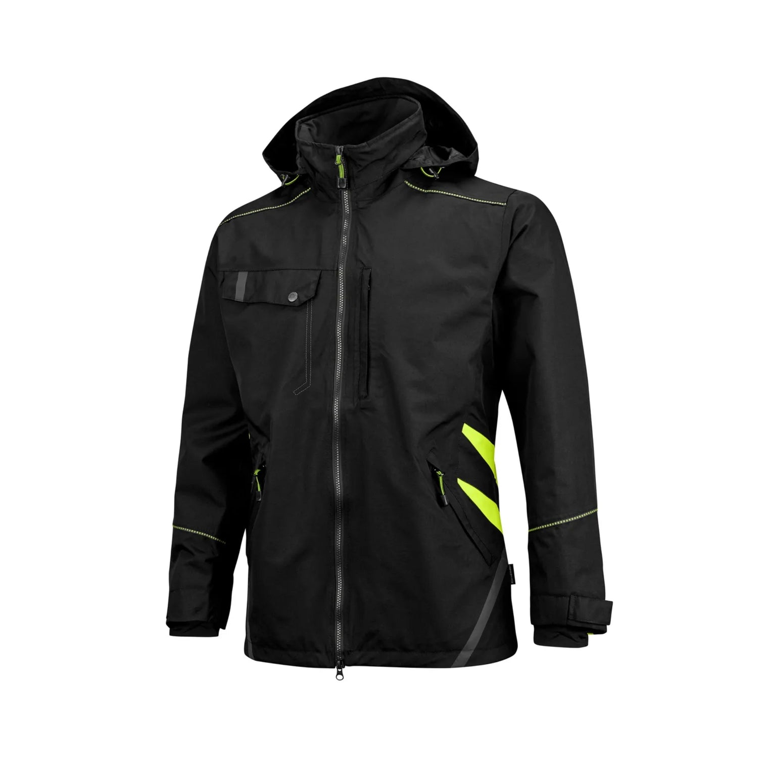 De gule kontrastpartiene og mørkegrå refleksene gir økt synlighet og sikkerhet i arbeidssituasjoner med dårlig lys. Jakken har to sidelommer med glidelås, en brystlomme med ID-kortlomme, og en innvendig lomme for sikker oppbevaring. Den avtagbare hetten kan justeres etter behov, mens regulering i ermer og nederkant gir optimal passform.