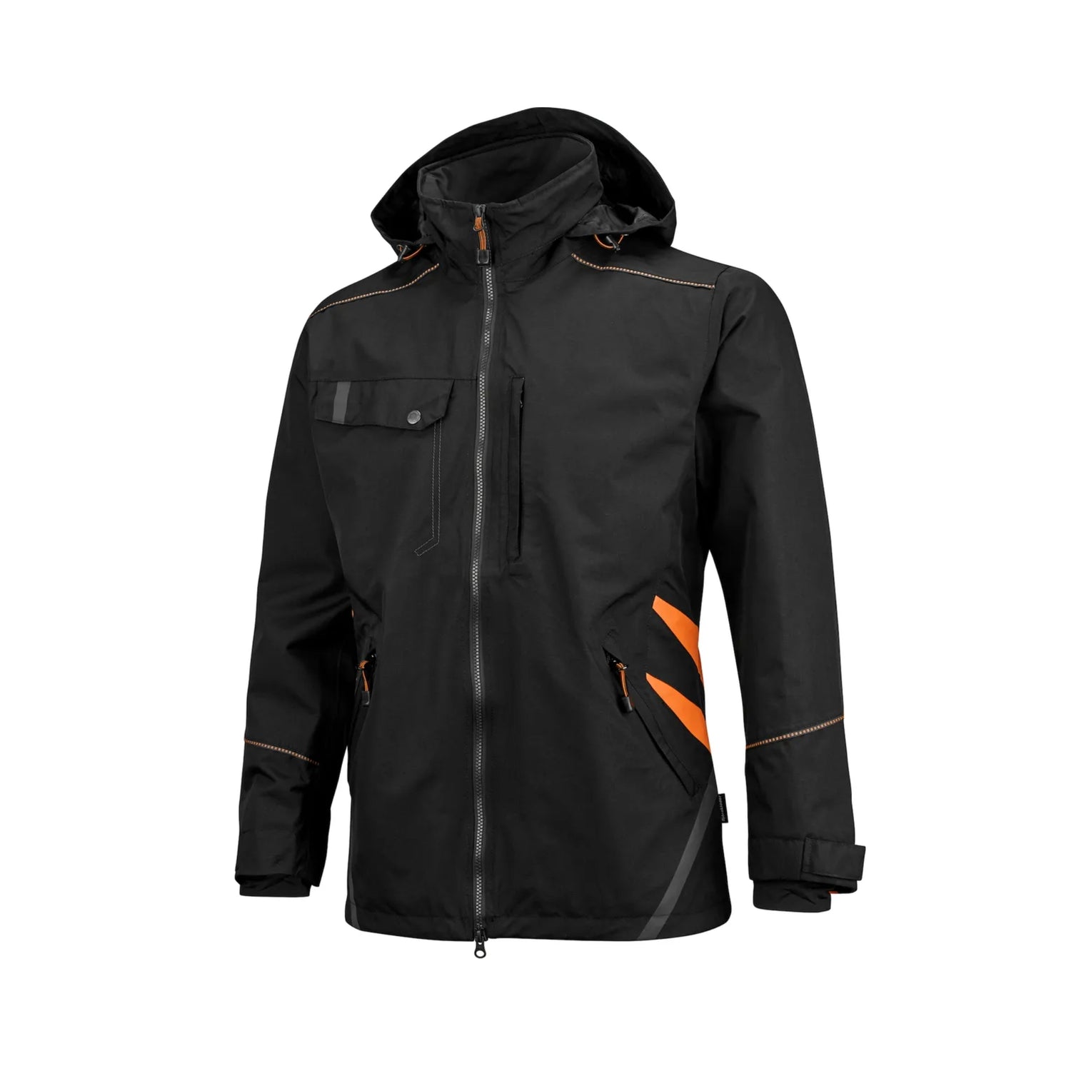 Jakken har oransje kontrastpartier og mørkegrå reflekser som sikrer god synlighet og økt sikkerhet ved arbeid i dårlig lys. Den er utstyrt med praktiske lommer, inkludert to sidelommer med glidelås, brystlomme med ID-kortlomme, og en innvendig lomme for trygg oppbevaring.