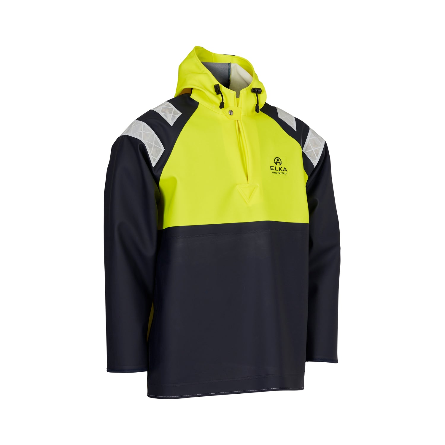 Denne regnanorakken fra Elka Unlimited-serien er designet for profesjonelle som trenger pålitelig beskyttelse i de mest krevende arbeidsmiljøene. Med en kraftig PVC Heavy-kvalitet på 600 g/m² og imponerende 15.000 mm vannsøyle, gir den maksimal motstand mot vann, vind, fiskeolje og ekstrem kulde.